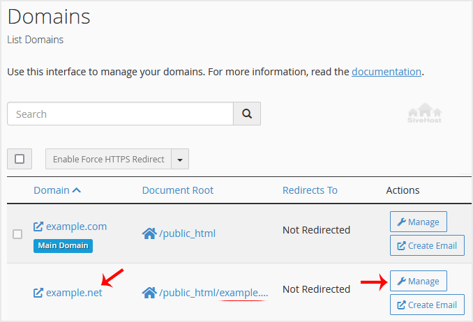 3. Locate the Subdomain you want to remove and click Manage next to it.